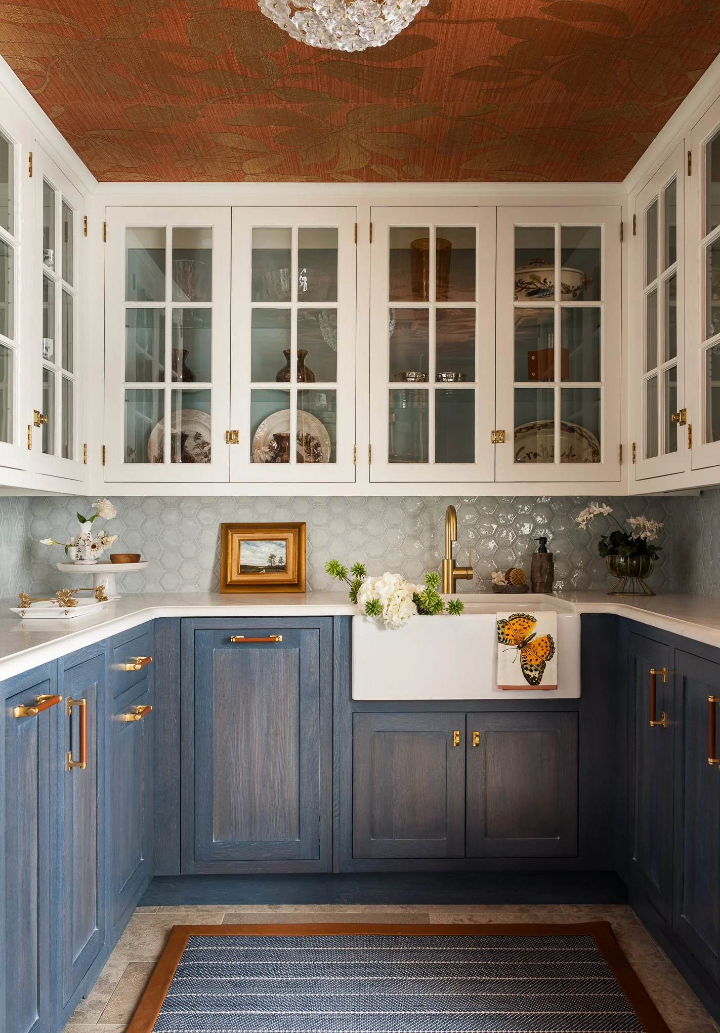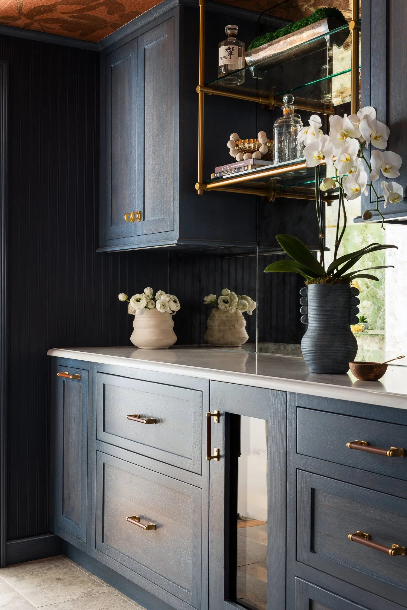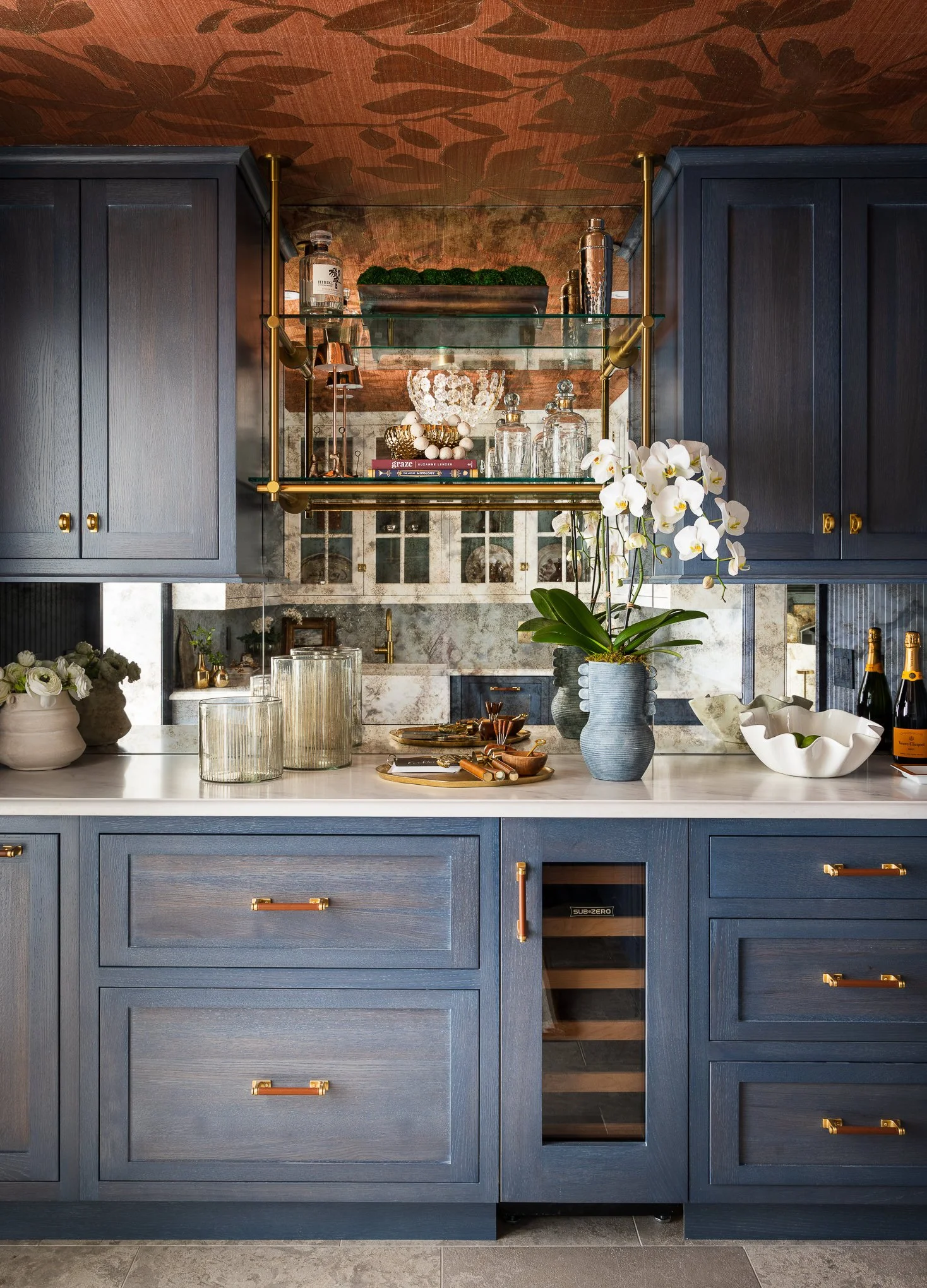 The reimagined Butler’s Pantry is a perfect fusion of function and beauty, designed for both daily ease and elegant entertaining. Restored salvaged glass cabinets display curated collections against moody cabinetry, striking a balance between classic charm and modern sophistication. A unexpected copper metallic floral grass-cloth ceiling adds warmth and subtle shimmer, enhancing the inviting ambience. Custom cabinetry and bespoke details integrate seamlessly with modern conveniences like a warming drawer, discreet beverage storage, and a compact dishwasher. Generous counter space ensures effortless hosting, whether mixing cocktails or prepping meals. More than a pantry, this jewel-box retreat is a statement of style, practicality, and timeless design. A fanfare to the grandeur of Wildfair! Cheers!